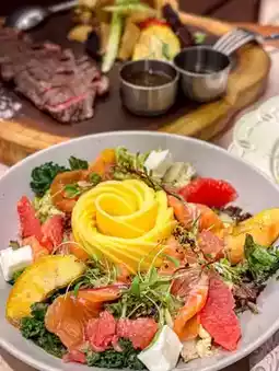 This salad combines the slight acidity of the sweet grapefruit of tropical fruits with the freshness of salmon