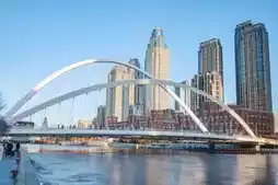 The sun and moon shine brightly. This bridge spans the Haihe River without piers, its simple elegance complementing the modern buildings on the shore.