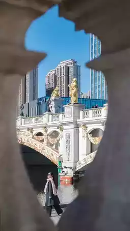 A blend of Chinese and Western styles, the bridge features a Western classical architectural style, with four mythical beasts as bridgehead statues and four musicians holding classical instruments.