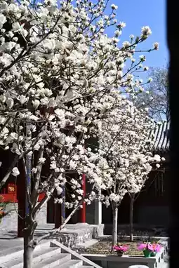 The magnolia flowers echo the ancient buildings in the Zen temple, the yellow glazed roofs, red windows and doors, blue couplets, and black and gold plaques, forming a unique contrast and harmony. It seems to be telling the story of the years, making you standing under the magnolia tree seem to hear the echo of history and have a conversation across time and space☎️