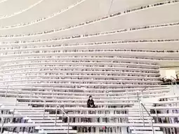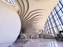 Known as “The Eye of Binhai,” this striking landmark in Tianjin is more than just a library—it’s a masterpiece of form and intellect. I arrived as evening settled, when the gentle glow from the arched glass façade met the flowing curves of the interior, transforming the space into something otherworldly. The central hall is a cascade of white, wave-like shelves rising floor to ceiling, wrapping around a glowing sphere—like standing inside a futuristic eye that quietly observes the city’s rhythm.