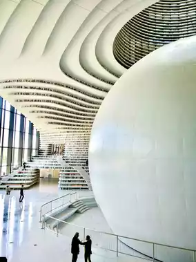 Next, head to the awe-inspiring Tianjin Binhai Library (滨海图书馆中心馆). Known as the “Eye of Binhai,” its futuristic design features a massive spherical auditorium surrounded by cascading shelves, making it one of the most photogenic libraries in the world.