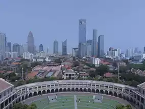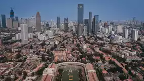 - Aerial highlight: Symmetrical composition of the cluster of international buildings