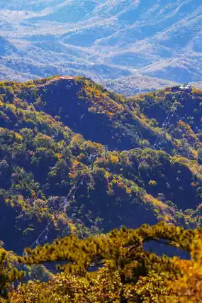 Take the Guayue Cableway directly to Guayue Peak at an altitude of 864 meters, overlooking the entire Panshan Mountain covered in colorful foliage with a 360-degree panoramic view. Then take the 28-minute Yunsong Cableway down the mountain. The cable car passes through a sea of colorful forests, as if you are inside a flowing painting, fully immersed in the scenery! This experience is my first time, so I highly recommend it~ Sitting in the cable car slowly rising, watching the forest below like a spilled palette, the immersive beauty is truly intoxicating.