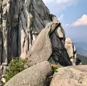 Composed of medium-grained monzonitic granite from the early Cretaceous period (128 million years ago). Since the vertical and diagonal joints are well-developed and intersect with each other on granite, deep weathering occurs, which causes the disintegration and collapse of the rock mass, eventually forming the pillar-like peak.