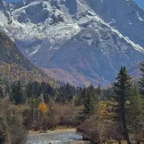 This village, nestled beneath the snowy mountains, offers a breathtaking beauty, complemented by the autumn foliage.