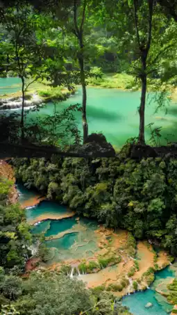 💧 Semuc Champey: A hidden gem in the valleys of Alta Verapaz, this natural gem features tiered, crystal-clear pools above the Cahabón River flowing beneath the rocky surface. Swimming in these natural pools and rafting through caves is pure and refreshing bliss.