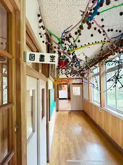 The wooden school building of the former Sanada Elementary School that remains in the center of Hachi village is the setting for the "Picture Book and Nuts Museum".