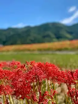 A blanket of crimson red spider lilies blooms along the embankment, creating a landscape often described as a sea of red.