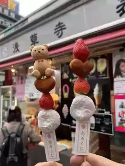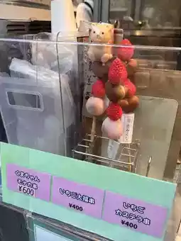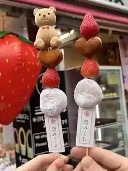 There are skewers with daifuku, strawberry, and castella, and some with bear-shaped monaka.