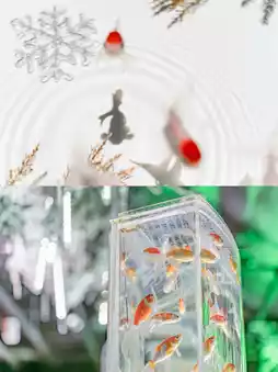 The endless corridor of goldfish is decorated with the Herrnhut star, which signals the beginning of Christmas, and ornaments, snow globes, and snow crystals decorating the area, creating a sparkling space.