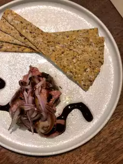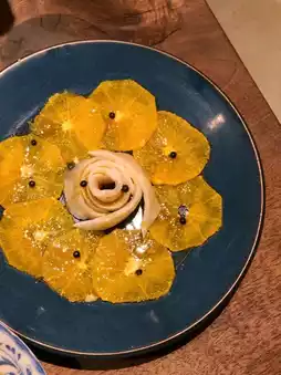 •Today's fresh fish (today it was tilapia) and orange carpaccio with caviar pepper