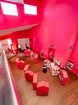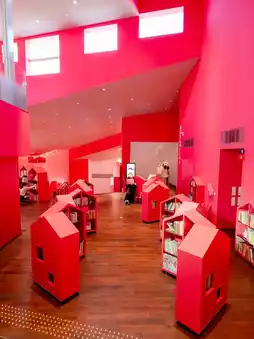A library surrounded by "house-shaped" bookshelves!