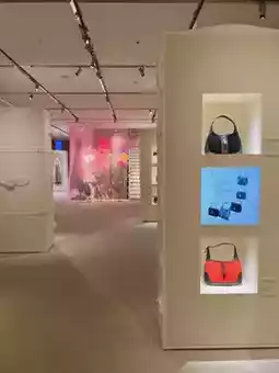 The futuristic entrance, handbags lined up on one side of the room, dresses worn by famous stars, and a playful space filled with the world of Gucci are a highlight✨