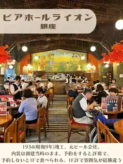 🏠 Beer Hall Lion Ginza 7-chome Branch 📍 〒104-0061 7-9-20 Ginza, Chuo-ku, Tokyo 🚶 5 minutes walk from Ginza Station Reservation: 2nd floor seats if you make a reservation, 1st floor seats if you don't 📷: ok