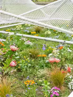 An area where a large hammock made from upcycled fishing nets that were going to be discarded is hanging over a sea of โโflowers