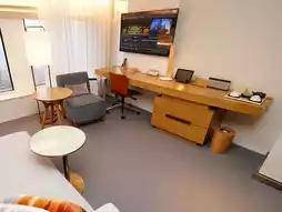 On one side of the room, there is a large work table and comfortable chair where I can work or read comfortably. Also, there is a comfortable seating area where I can relax and enjoy the view from the window or watch TV.