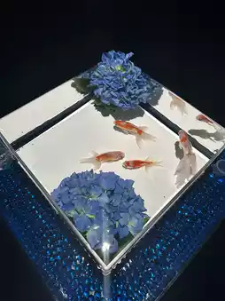 A purple-colored aquarium, a collaboration of hydrangeas and goldfish indoors, the inside of the tank and the flowers are all hydrangeas, so you can enjoy cherry blossom viewing even in the rain 😊