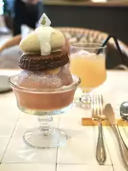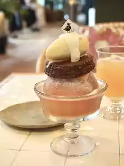 A whole peach floating in peach soup is used luxuriously, and cacao pie and vanilla ice cream are placed on top
