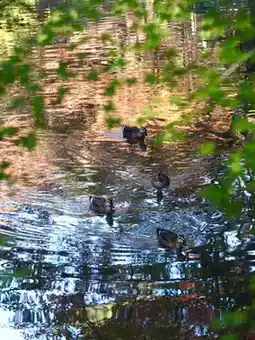 The snow hangings and autumn leaves reflected in the pond make for a spectacular view.