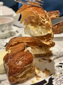 The pie crust is made up of several thin layers, and although it crumbles easily, I was able to eat it beautifully by twisting the pie crust with the cream.