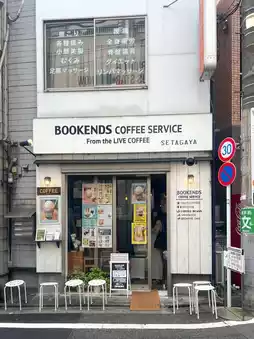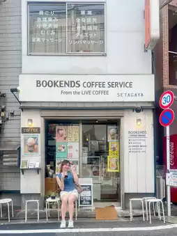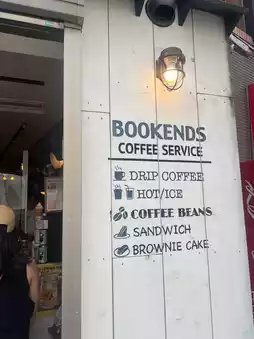 We stumbled upon this cute little cafe, "Bookends Coffee Service." It's a small shop with a beautiful photo opportunity, perfect for a relaxing break.