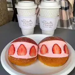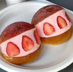 The brioche dough is filled with strawberry-flavored cream and topped with sliced strawberries.