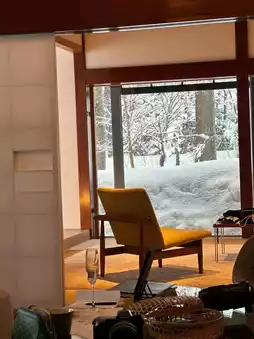The sauna is a transparent glass room with a beautiful snow view. It's open 24 hours.