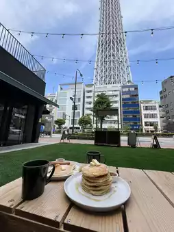 I ordered their buttermilk pancakes and sausage and egg pancakes. Both were incredible! The pancakes were fluffy and soft, and the sausage and eggs were cooked to perfection—definitely satisfying and filling! Plus, you can enjoy your meal while gazing out at the iconic Tokyo Skytree from the terrace, which adds a nice touch to the experience.