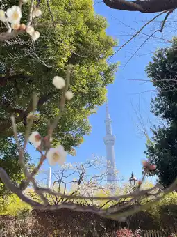 The atmosphere is great—enjoy the view, the cherry blossoms, and trains passing by. You can see the Asahi building with its beer foam symbol, making it a perfect place to relax.