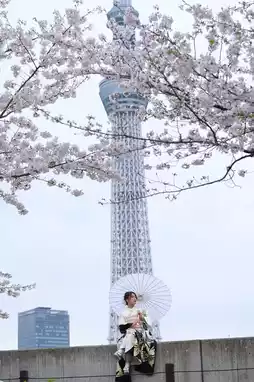 On April 10th, I had the chance to photograph my friend in a beautiful traditional kimono at Sumida Park, with cherry blossoms still in full bloom. The soft petals lined the paths along the Sumida River, with the iconic Tokyo Skytree rising majestically in the background.