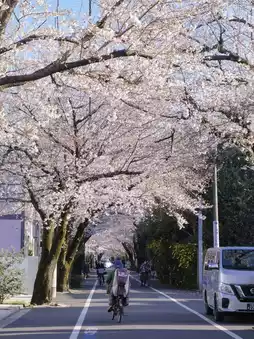 Perfect for walking or cycling. There are many beautiful Japanese-style buildings intertwined with cherry blossom trees. The area covered by cherry blossoms is quite large, so you can just wander and snap great photos effortlessly.