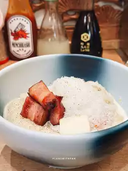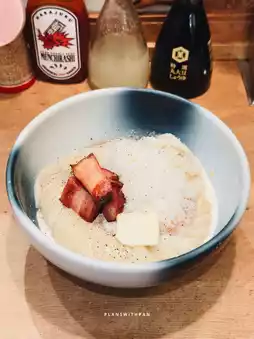 This signature dish blends Japanese udon with Western-style carbonara sauce. The chewy udon noodles are mixed with butter, cheese, black pepper, and fresh egg yolk, topped with thick, tender bacon.