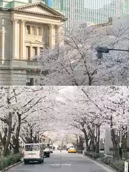 Between beautiful buildings such as the Bank of Japan Head Office (a designated Important Cultural Property completed in 1896), Sumitomo Mitsui Banking Corporation, and Mitsukoshi, a row of cherry trees continues.