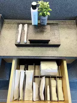 The interior is unified with a minimalist design using traditional Japanese materials such as washi paper, wood, and stone, with the living room and bedroom separated by sliding doors🍃 In the living space, a black sofa inspired by an "engawa" (veranda) is installed, allowing you to enjoy the view by the window🌃