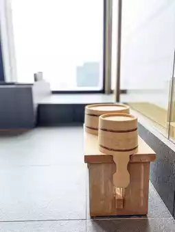 The bathroom features a Japanese-style deep bathtub with a black base, and the stone floor is equipped with floor heating, enabling a comfortable bath🛁✨ Additionally, a cypress chair and bucket are provided, reflecting attention to Japanese details in every aspect☺️