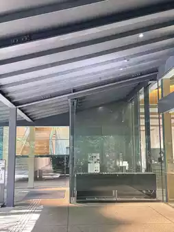 The exterior is a refined architecture (designed by Kengo Kuma)