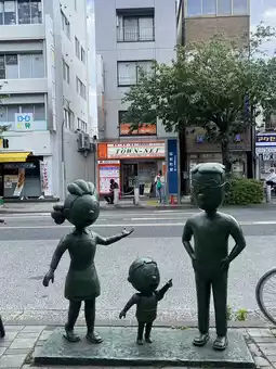 📸 The famous photo spot is the **"Bronze Statue of the Sazae-san Family"** right in front of the station!