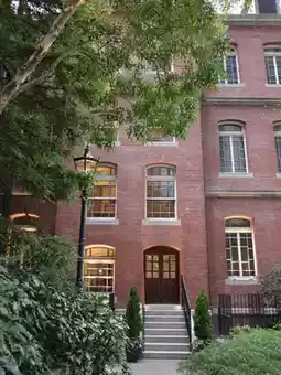 A brick Western-style building, a beautiful courtyard, and a staircase with a red carpet.