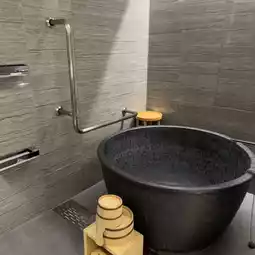 The huge Shigaraki ware bathtub, even if it’s not hot spring water, soaking in it is still very enjoyable.
