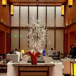 The drop-off area is simple and restrained, not deliberately pursuing luxury. Entering the lobby, a giant fan-shaped installation intertwined with cherry blossom imagery forms the visual focus🌸. The space is laid out symmetrically along a central axis, with a high ceiling design creating a sense of order. The lobby doesn’t show off but settles emotions under the theme of "wood as the source of water."