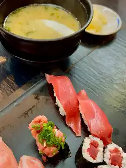 The set includes 13 pieces of sushi featuring different parts of the tuna, plus a large bowl of miso soup.