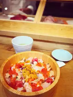 The mixed sashimi rice bowl, nicknamed the “Tsukiji Jewel Box,” is a visual feast with various seasonal fish piled high, offering a double delight for both the eyes and taste buds.