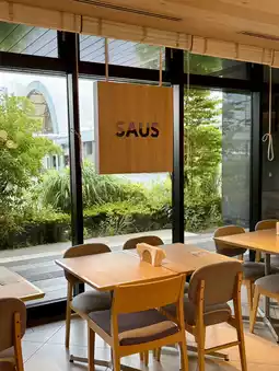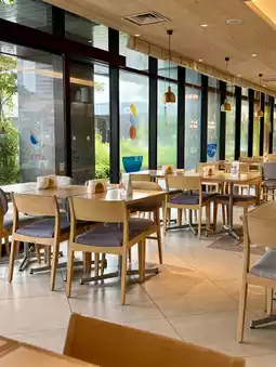 The spacious area with large windows letting in natural light features comfortably arranged sofa and table seats. It offers a refined and calm hotel ambiance, perfect for lunch breaks during exhibitions, weekend girls’ gatherings, or dates.