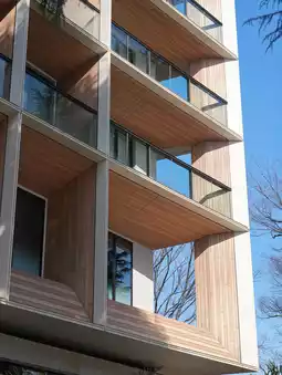 The stunning exterior features elegant wooden curves. With excellent access, it's just two train stops from Shinjuku and within walking distance from both the New National Stadium Station and Sendagaya Station!