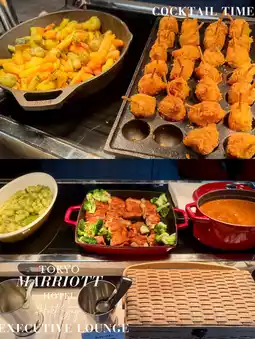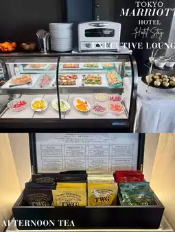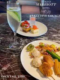 The Executive Lounge, used with Marriott Platinum benefits, offered almost all-day alcohol, breakfast, afternoon tea, and cocktail time with a rich food presentation
