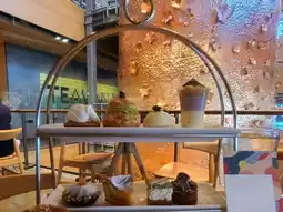The savory items in this afternoon tea include a brioche handmade burger and a scone topped with prosciutto and dried tomatoes, both of which have a delightful sweetness as if honey were added.