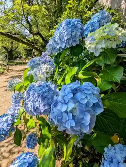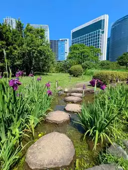 Located in Minato Ward, Hamarikyu Gardens is one of Tokyo's nine famous gardens. What makes this garden unique is its juxtaposition of towering skyscrapers and the serene view of Tokyo Bay. The garden is grand and offers a distinctive landscape. Visiting in early summer, particularly in June, you'll find the garden adorned with hydrangeas and irises. The blue, purple, and crimson flowers beautifully complement the pine trees and lush green lawns, creating a charming atmosphere.