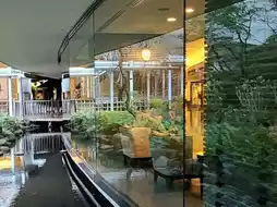It is convenient because you can easily go back and forth by bus. When you enter the 1st floor, they kindly take care of your suitcase. It is like a hot spring hotel or a large resort-type ryokan, and the arcade extends long and narrow around the garden.