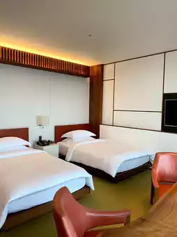 The rooms are spacious with calming wood-grain interiors. The bathroom is beautifully designed, and I was soothed by the deep bathtub🛁